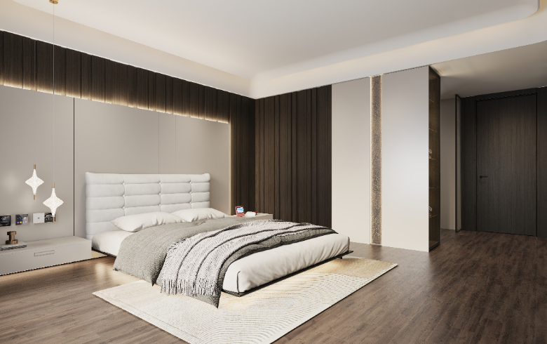 床頭背景墻采用深淺的撞色設(shè)計(jì),奶白色護(hù)墻板搭配棕色格柵板,分段式設(shè)計(jì)前后對(duì)比,打破沉悶,極具視覺(jué)層次感。意式極簡(jiǎn)床品,全案軟裝配套,讓 Amy從財(cái)務(wù)數(shù)字世界里解脫,步入美夢(mèng)空間。