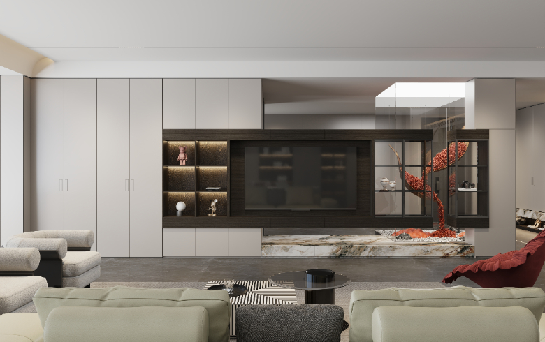 奶白色背板搭配深色開放格,輕松打造高級(jí)感電視背景墻;底部懸空放置植物與擺件,讓業(yè)主在閑暇之余,感受到空間帶來(lái)的呼吸感。