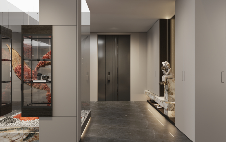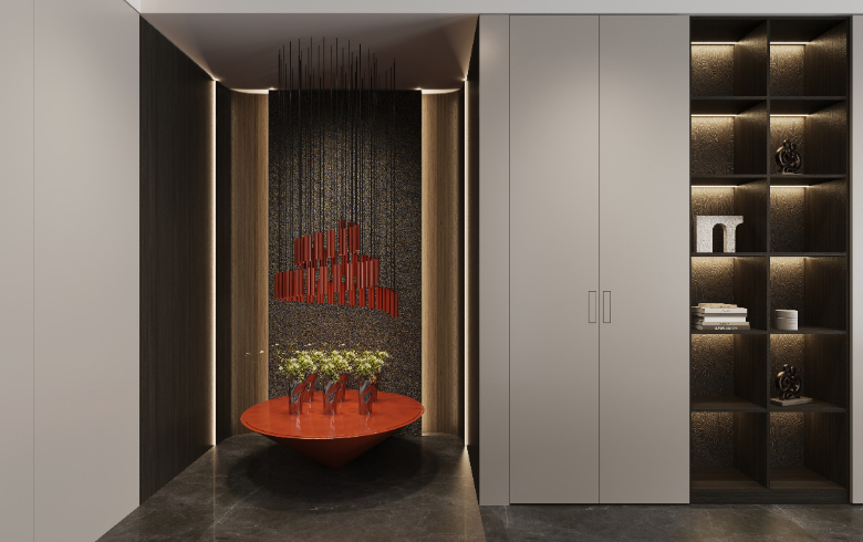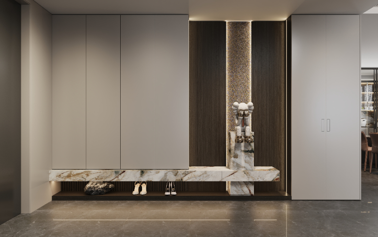 通頂玄關(guān)柜橫向延伸,收納翻倍。底部懸空方便換鞋,提升入門整潔度,地臺(tái)加持,高級(jí)加倍;中部鏤空開放,擺設(shè)飾品,放置出門必備物,生活的并井有條從歸家開始。