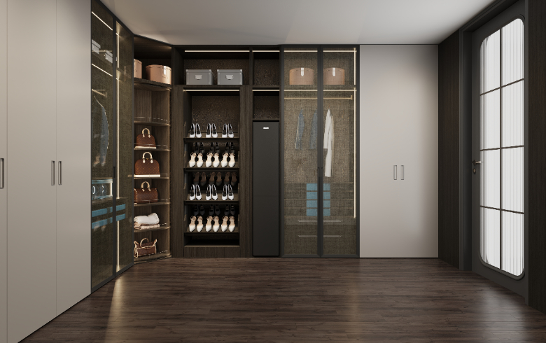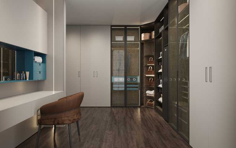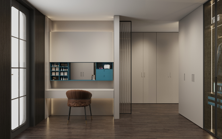 衣帽間設(shè)置梳妝臺(tái),模塊化功能分區(qū),秩序井然,兼具實(shí)用性與視覺(jué)美,新穎別致的開放格設(shè)計(jì),滿足Amy放置常用的護(hù)膚化妝品。