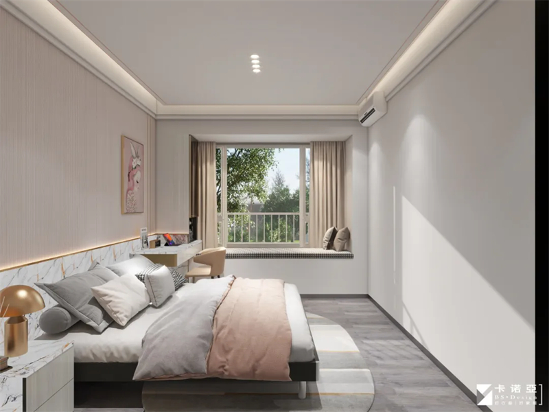 床頭處打造學習區(qū),床頭柜做成懸浮式書桌,與飄窗柜一體化設計,開放格妥帖安置書本,安靜獨立學習區(qū)讓孩子一眼就心動~