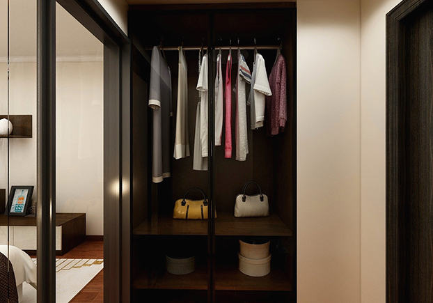 ▲主臥旁邊做了一個入墻衣柜,將異形空間利用起來,可以放一些平常利用率高的衣物和包包,上班急著出門直接從這兒拿,方便又快捷。