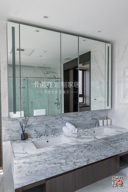 深色浴室柜體點(diǎn)睛,加上大面積玻璃的使用,衛(wèi)生間大氣明亮,空間通透開闊。