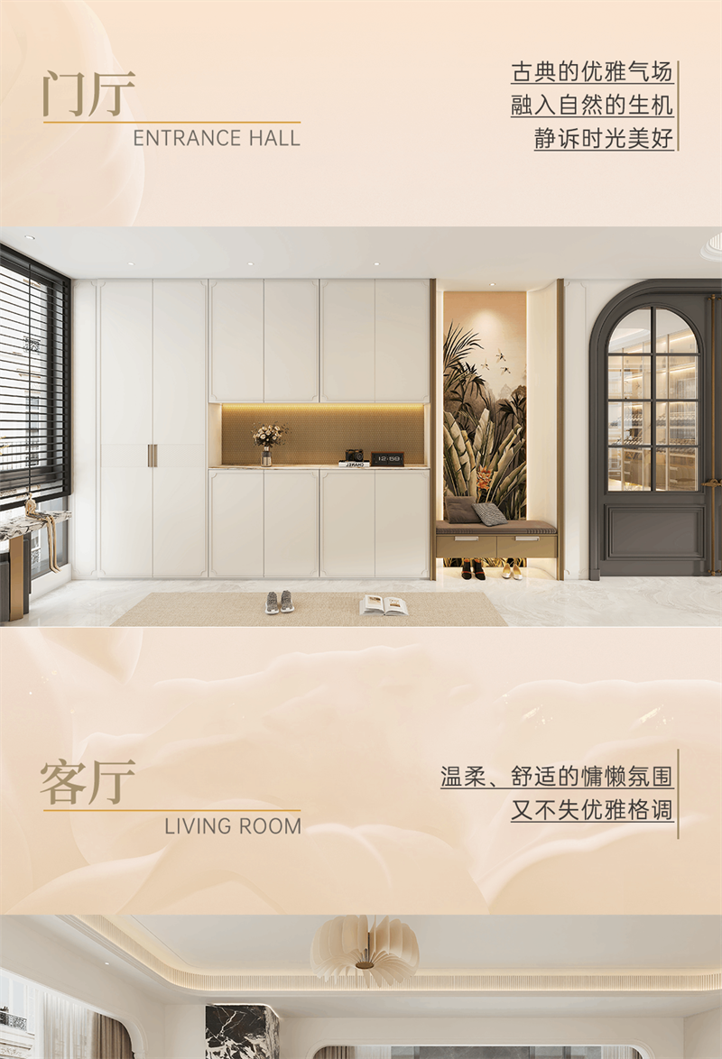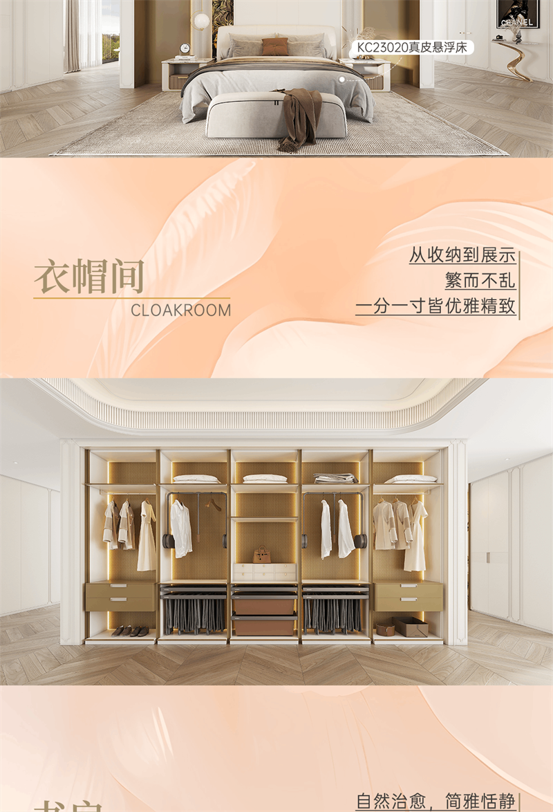 系列產(chǎn)品整體以奶油白和金色元素為空間基調(diào),將法式的氣質(zhì)融入現(xiàn)代空間,以精致細(xì)節(jié)的融入,讓家成為容納更多想象的美好生活殿堂,讓“美”成為一種生活態(tài)度。
