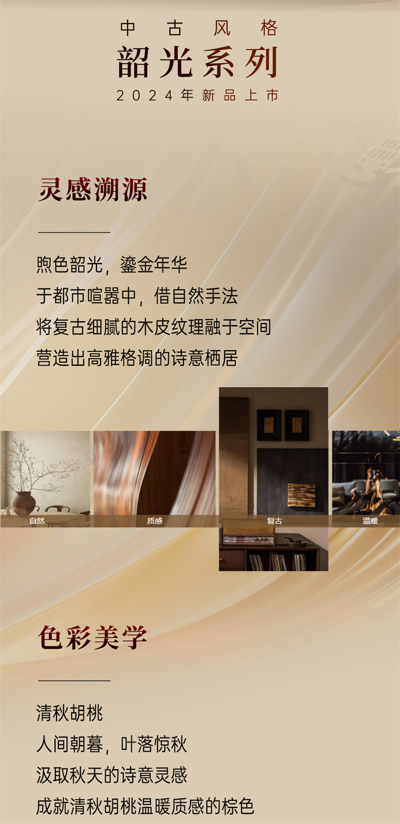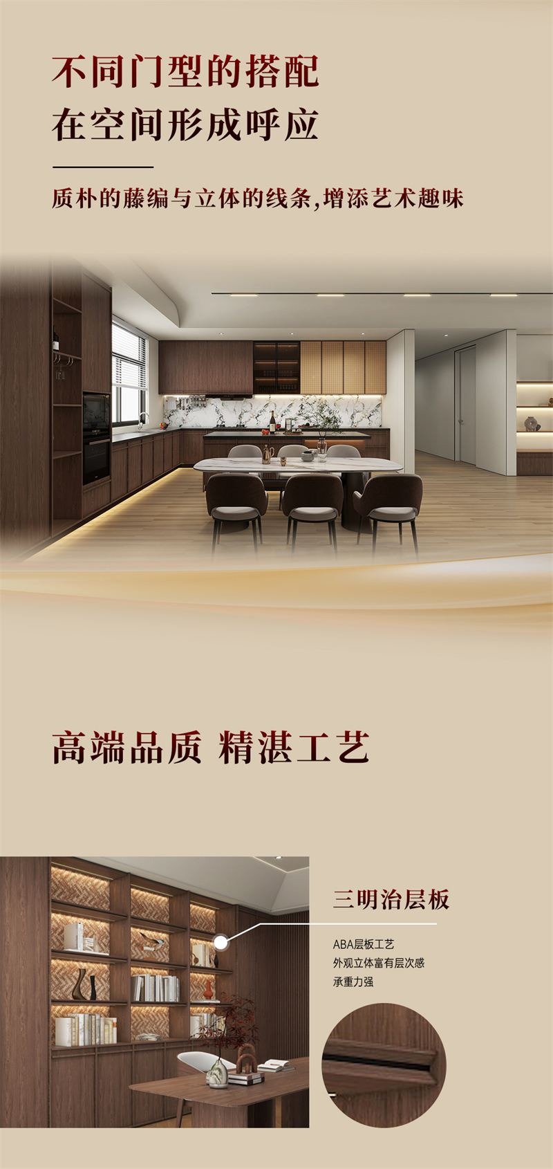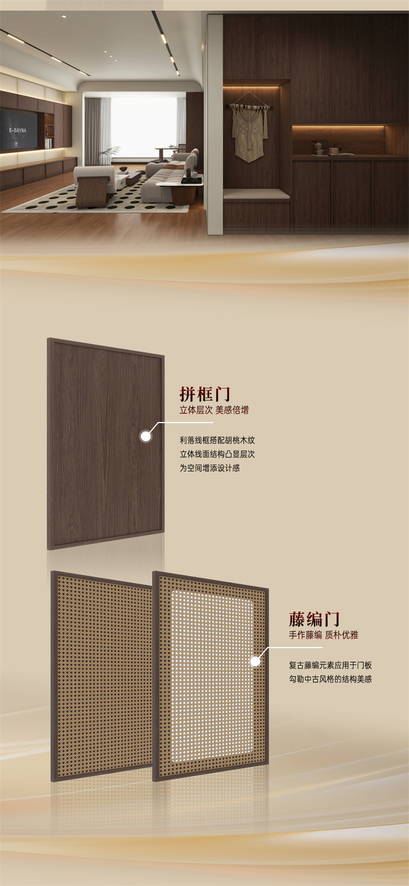 2024年新品系列,韶光 |中古風棕色胡桃木紋為主色調(diào),搭配白色暗紋,細膩的藤編門與硬朗的骨骼門讓人聯(lián)想到古老的家具,充滿了歲月的痕跡。木紋的邊框+細密的藤編,自帶復古朦朧美感;拼樞門和藤門結(jié)合運用,使整個空間透氣感強,并擁有獨特舒適的慵懶氛圍。