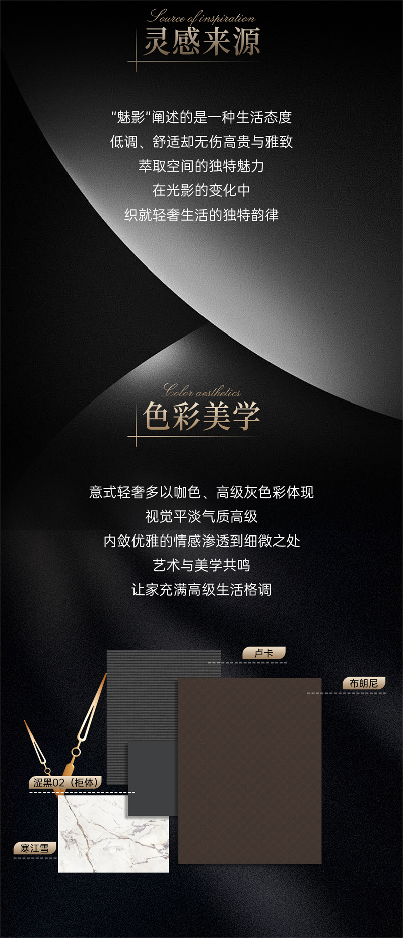 魅影系列所闡述的是一種生活態(tài)度,以及一種追求品質(zhì)和精致生活的生活狀態(tài),低調(diào)、舒適卻無傷高貴與雅致,萃取意式輕奢靈韻,精準(zhǔn)勾勒空間輪廓,刪繁就簡,織就獨(dú)特韻律。
