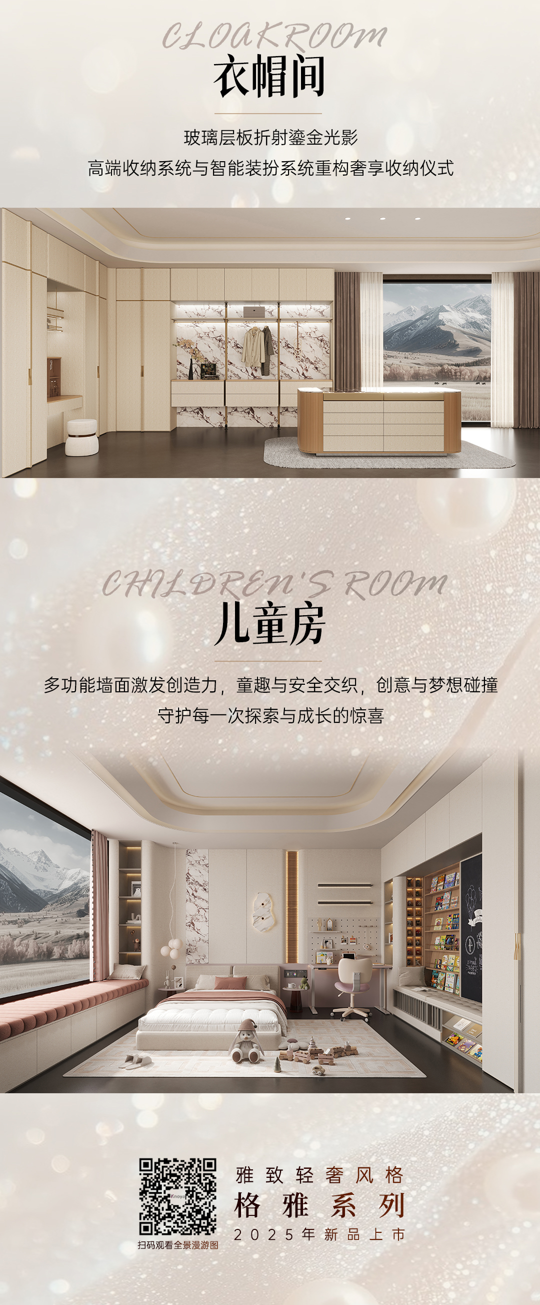 2025年新品系列,格雅系列 |雅致輕奢風(fēng)格從珠寶中獲得靈感,專(zhuān)注于體積、線性與移性的精妙把握,巧妙展現(xiàn)藝術(shù)與建構(gòu)間的微妙關(guān)聯(lián),以居者需求為基礎(chǔ),依據(jù)整體空間開(kāi)放度的細(xì)膩層次,打破傳統(tǒng)界限,賦予空間前所未有的靈動(dòng)與多元。人群定位:30至45歲藝術(shù)家家庭,對(duì)生活品質(zhì)持有極致追求