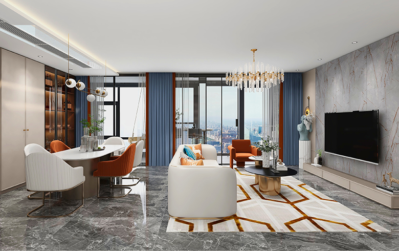 客餐廳打通,沙發(fā)隔斷,兩個空間相對獨立又相連。多人位白色沙發(fā),混搭單人位暗紅色沙發(fā),與餐桌椅在色彩上有呼應。選擇歐式水晶吊燈,貴氣呼之欲出。一字型電視柜,臺面采用帶有木紋的“流光漫步”,減緩空間大理石與灰色系的冷感。