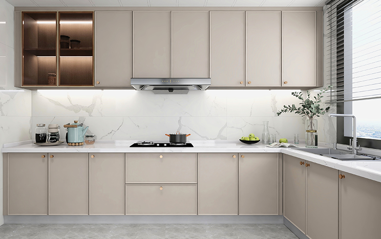 長條形廚房定制L型廚柜,轉(zhuǎn)角不浪費,大量的地柜、吊柜,炊具刀具調(diào)料通通隱藏,讓臺面保持整潔。吊柜中加入玻璃材質(zhì)+燈帶,一改整堵墻封閉式柜子的壓迫感,下廚多了一份輕盈。應用高級“優(yōu)雅暖灰”,瞬間營造高端廚房印象。