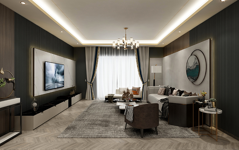 沙發(fā)圍合式布局,使用更便捷。電視墻呼應(yīng)沙發(fā)墻,“玉光白”、“銀河黑”格柵板、“棕絲木”、“布拉格”等高級色混搭,營造視覺盛宴。