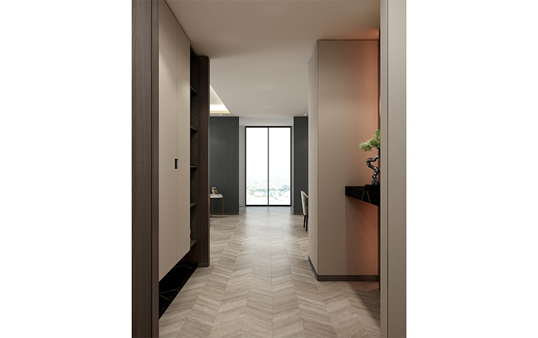 高顏值的鞋柜與玄關(guān)分布在過道兩邊,讓狹長的過道視覺不單一,成為一道靚麗的風(fēng)景線。
