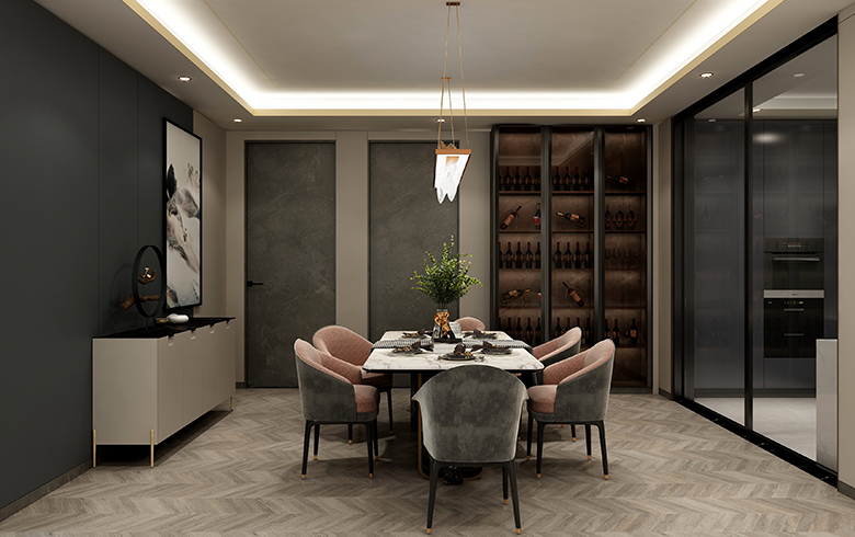 高端黑灰玻璃門餐酒柜,一門到頂,展示更多名酒,彰顯屋主非凡品味。粉色高級絲絨餐椅,融化極簡高冷范,讓用餐親密無間。