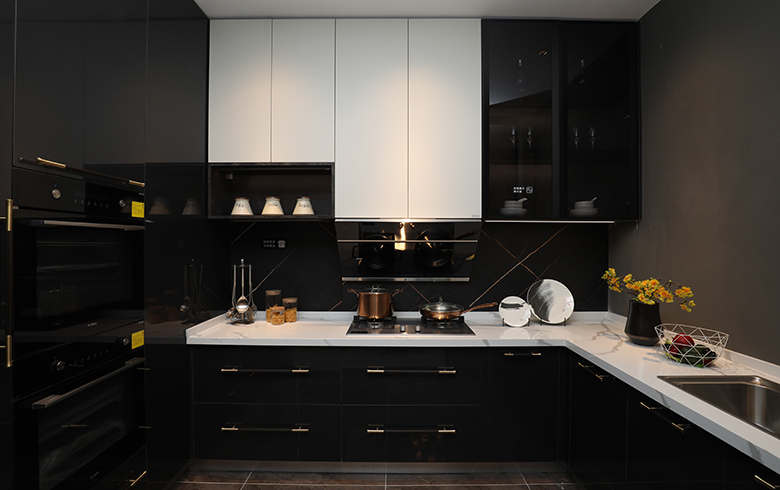 U型櫥柜,動線合理,極致利用轉(zhuǎn)角空間。大面積使用沉穩(wěn)色調(diào)“黑曜石、黑金剛、銀翼絲”,加入“嬌月白”,減緩空間沉重感,讓烹飪輕松自在。
