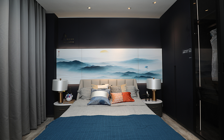 床頭護(hù)墻板3D中式山水畫,意境悠遠(yuǎn),大美無言。衣柜時(shí)尚的“浩瀚深藍(lán)”門板搭配端莊的“黑金剛”柜體,盡顯深厚的人文內(nèi)涵。