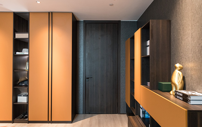 臥室門的顏色選擇,注重與整體家具相搭配,同時(shí)與室內(nèi)的墻面顏色形成一定的反差,讓臥室顯得更加有層次。為了改變深色調(diào)的沉悶感,地面采用淺色木紋的木地板,衣柜等臥室家具的門板采用橙黃色,點(diǎn)亮了空間的活力,營(yíng)造沉穩(wěn)中帶有溫馨的氣氛。