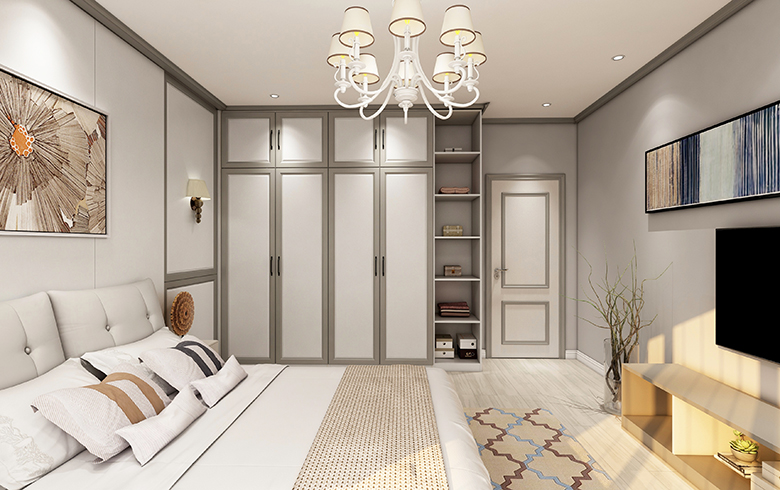 簡(jiǎn)歐風(fēng)格特有的方正造型灰色邊框的木門,一改木門平面單一的視覺印象,同時(shí)與到頂衣柜、護(hù)墻板在紋理及材質(zhì)上相呼應(yīng),整體空間寧?kù)o素雅,溫暖直抵人心。