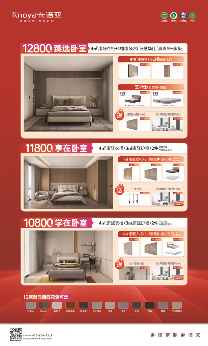 五一大促,卡諾亞力推12800元臻選臥室套餐,以及針對幸福老年的11800元享在臥室套餐、學生一族的10800元學在臥室套餐,不僅實現(xiàn)消費者一站式購齊,還為其帶來更多的便利和千人千面的個性化解決方案。3大套餐均包含4㎡康醛衣柜,可選十余款時尚個性的飾面花色,還有3㎡康醛護墻板、1樘康醛木門、2件專屬臥室家具、芝華仕大牌真皮床+床墊,驚喜獲贈6米或4米A類母嬰級環(huán)保窗簾、1.2米定制書桌、升降衣架等,套餐明細請親臨門店咨詢??ㄖZ亞精心設計的臥室套餐,可確保與整體家居布局的協(xié)調(diào)與統(tǒng)一,全面提升臥室氣質(zhì),滿足不同消費者的進階居住體驗和對品質(zhì)美好生活的追求。
