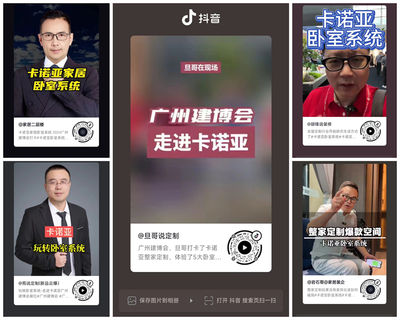 本屆建博會,卡諾亞打通線上線下流量場,橫向做輻射,縱向做滲透。以“卡諾亞臥室系統(tǒng)超級IP”為傳播主線,特邀抖音達(dá)人@旦哥說定制、@娜仁格日勒、巖石哥@家居裝企、@家居二層樓、@苑說定制、@胡鋒說裝修,小紅書達(dá)人@ Snow雪芙、@愛生活的阿胖,以及權(quán)威媒體搜狐焦點家居、慧亞招商網(wǎng)、中華全屋定制網(wǎng)等紛紛前來卡諾亞展館,進(jìn)行專業(yè)探展與沉浸式體驗,以直播、短視頻等形式,集體為卡諾亞臥室系統(tǒng)背書。這些家居頂流KOL,展前利用短視頻打Call造勢,展中第一時間多維度現(xiàn)場體驗卡諾亞臥室系統(tǒng)的諸多亮點,為卡諾亞臥室系統(tǒng)在建博會上強勢吸睛助力,展后則深度解析卡諾亞臥室系統(tǒng)作為切入點,帶動整家定制的全案服務(wù)與成交推廣的財富密碼。