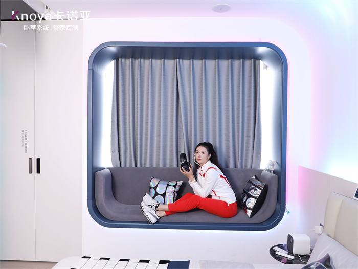 進入“樂在臥室”系列產(chǎn)品時,陳曉君禁不住坐在了卡諾亞專為活力青年設計的太空艙飄窗上,打開繽紛極光燈時,整個空間充滿了未來的科幻感,仿佛置身極地的星空下,美輪美奐,讓人充滿遐想。針對年輕人喜愛的潮流手辦,專門打造的展示柜,讓心愛的“它”有了歸屬??吹娇缮惦姼傋?,我們的體育明星也童心未泯,忍不住坐到電競椅上,敲打鍵盤,點擊鼠標,準備開黑呢!更讓陳曉君驚奇的是,這里還有一個隱藏式投影屏幕,躺在床上就可以看電影、看動漫,搭配床頭投影出水波紋的藍光,在場的人都沉浸在對浩瀚星際的幻想中。