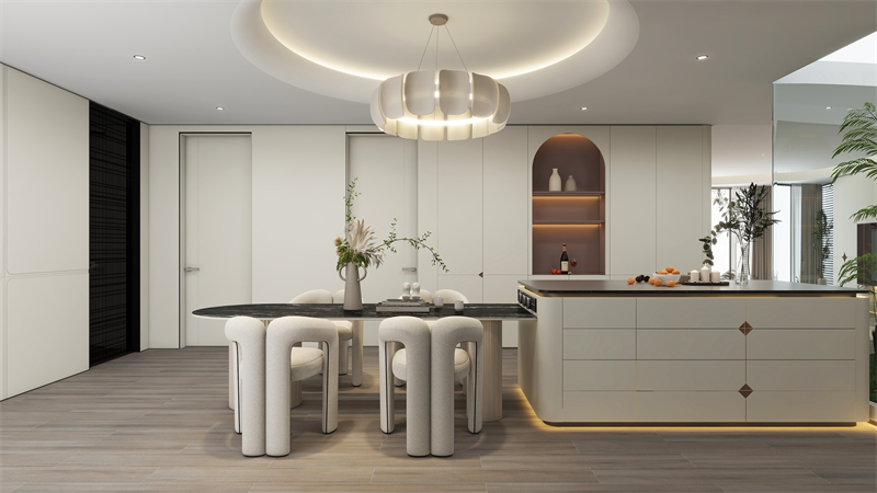 開(kāi)放式餐廳布局,島臺(tái)+餐桌一體化設(shè)計(jì),富有造型的餐椅搭配,中和了空間的單一感。簡(jiǎn)約清爽的“白芷”配色,隨處可見(jiàn)的三角幾何門(mén)型點(diǎn)綴,賦予用餐時(shí)光,更多有趣的生活情調(diào),讓家人縱享美味佳肴。