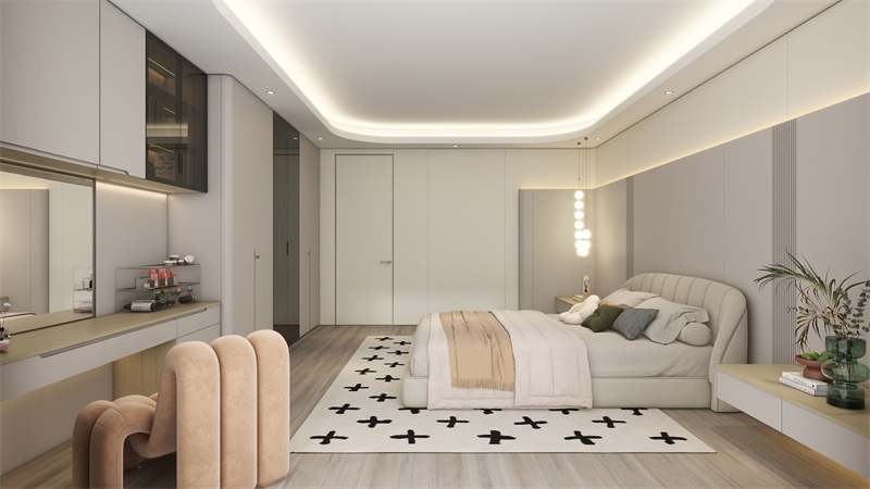 打破傳統(tǒng)墻面直線條的常規(guī)設(shè)計(jì),圓弧護(hù)墻板以更柔和的曲線語(yǔ)言,勾勒臥室的柔美與靜謐,搭配奶油色系軟裝,簡(jiǎn)單耐看,營(yíng)造深度睡眠的舒適環(huán)境。