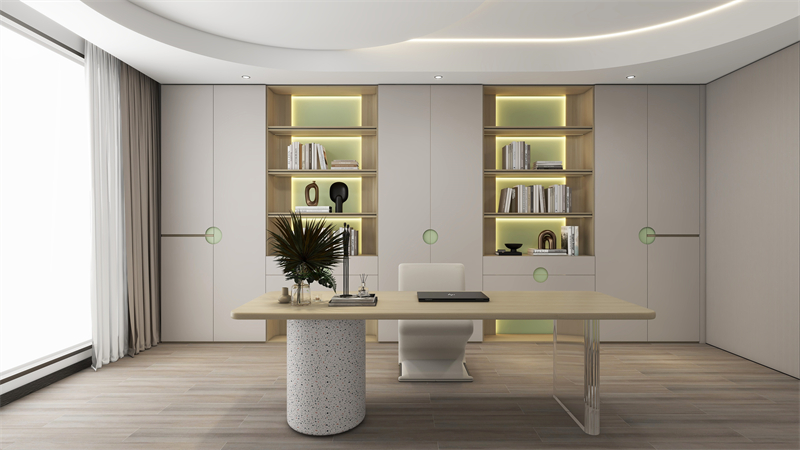 書(shū)房以溫馨的白色調(diào)為主,增添濃郁的溫暖氛圍,讓人沉浸于書(shū)香墨韻之中。綠意盎然的“夏檸”作為點(diǎn)綴色,清新脫俗的配色,宛如春風(fēng)拂面,帶來(lái)生機(jī)勃發(fā)感,讓工作學(xué)習(xí)輕松愉悅。