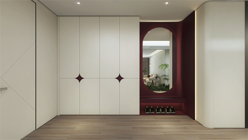 圓弧形的轉(zhuǎn)折處理,使得玄關(guān)區(qū)域在視覺(jué)上更加流暢與連貫,宛如自然延伸出的一個(gè)優(yōu)雅弧度,引領(lǐng)家人順暢步入家中。下方保留開(kāi)放式常換鞋區(qū),簡(jiǎn)潔實(shí)用;圓弧拼接門(mén)型搭配“白芷”、“紅鸞”撞色點(diǎn)綴,打破傳統(tǒng)色彩界限,賦予空間柔和而深邃的視覺(jué)層次。