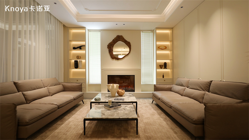 客廳空間,采用卡諾亞新品輕法式風格爾漫系列,勾勒溫柔、舒適的慵懶氛圍又不失優(yōu)雅格調(diào)。