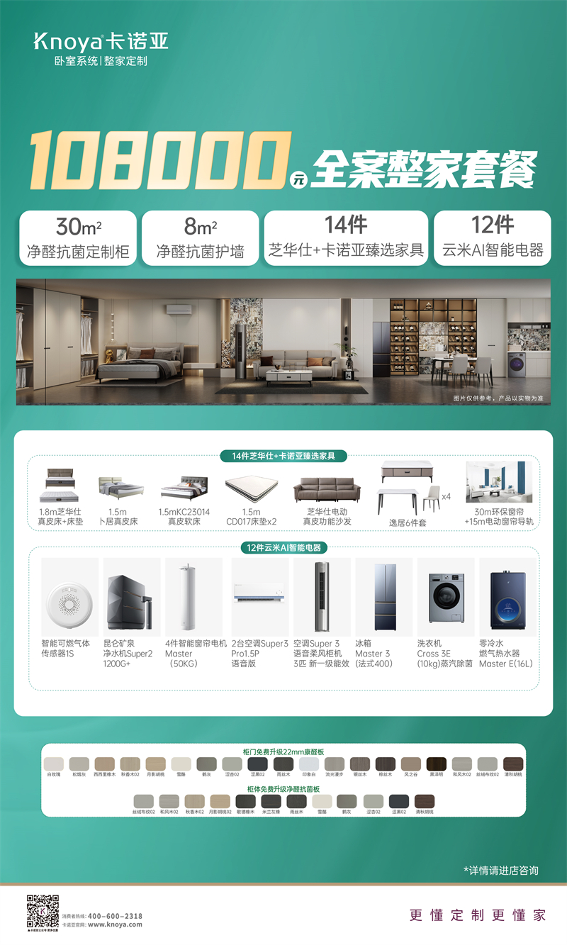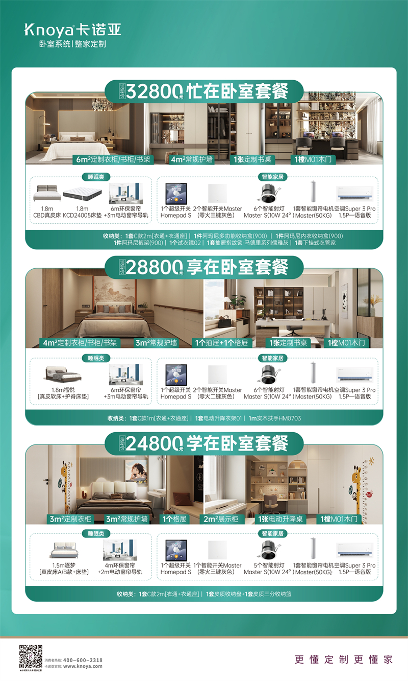 卡諾亞此次315活動(dòng),攜手多個(gè)高端品牌如芝華仕、CBD、云米科技等,為消費(fèi)者提供一站式的家居解決方案?;顒?dòng)期間,卡諾亞除了以上2大套餐,還精心推出32800元忙在臥室套餐、28800元享在臥室套餐、24800元學(xué)在臥室套餐等,涵蓋臥室系統(tǒng)+整家定制兩大品類,包括定制柜、護(hù)墻板、全屋家具以及智能家電,聯(lián)手更多大牌,真正實(shí)現(xiàn)“整家定制更高配,全屋家具更滿配,智能家電更全配”的理念。