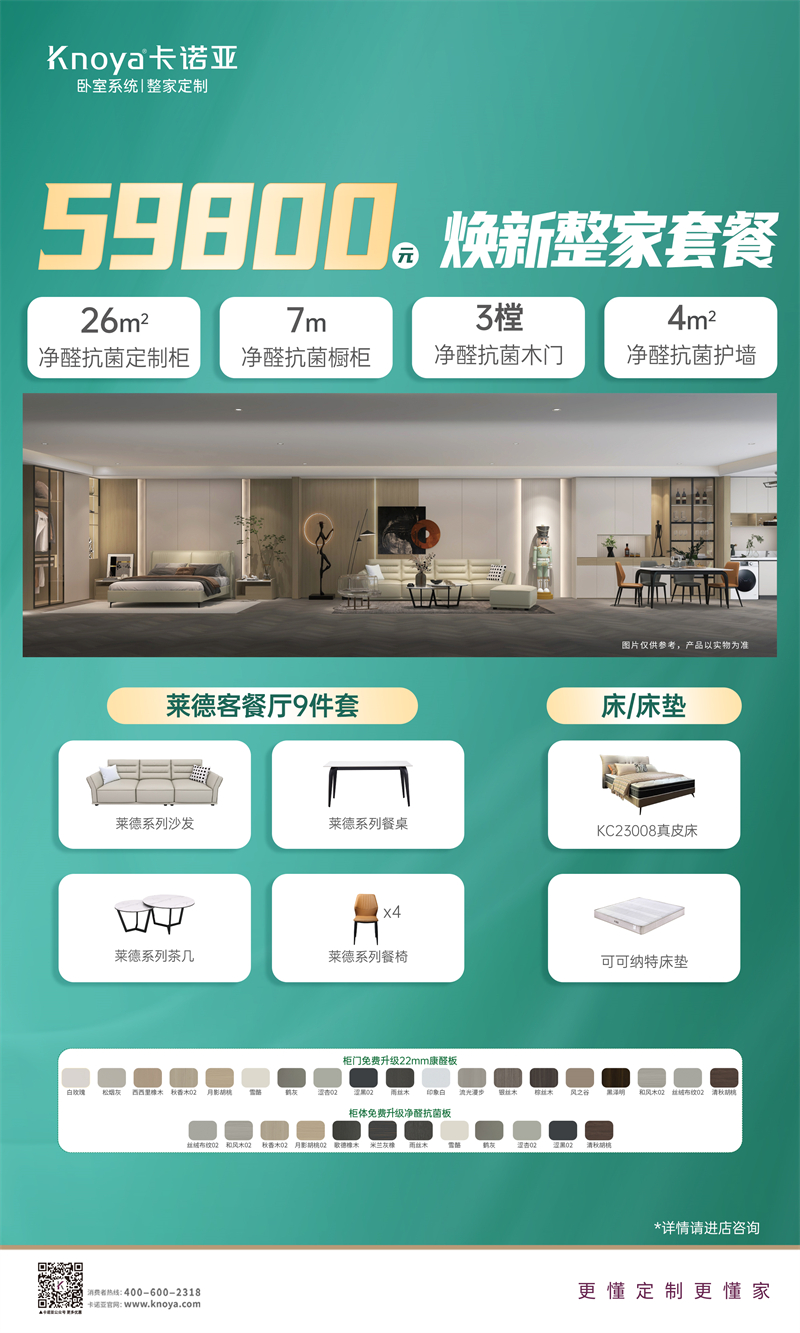 卡諾亞59800元全屋升級(jí)凈醛抗菌家套餐,采用凈醛抗菌板,擁有基材無醛添加、達(dá)ENF級(jí)國(guó)家最嚴(yán)環(huán)保標(biāo)準(zhǔn)、除醛、抗菌、防霉等優(yōu)勢(shì),為毛坯房裝修、舊房改造以及精裝房的局部?jī)?yōu)化提供了一站式的解決方案。
