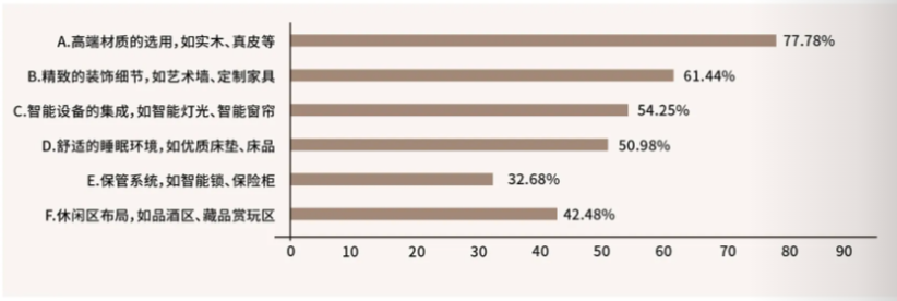 《中國(guó)臥室生活方式洞察報(bào)告》顯示,臥室生活占據(jù)人生至少三分之一的時(shí)間,其舒適度和功能性對(duì)提升生活質(zhì)量至關(guān)重要,不同人群對(duì)于臥室生活的需求是不一樣的。在打造高品質(zhì)臥室方面,高凈值人群尤其注重高端材質(zhì)的選用、精致的裝飾細(xì)節(jié)以及智能化設(shè)備的應(yīng)用。具體來(lái)看,77.78%的受訪者認(rèn)為高端材質(zhì)不可或缺,61.44%的人認(rèn)為精致細(xì)節(jié)同樣重要。