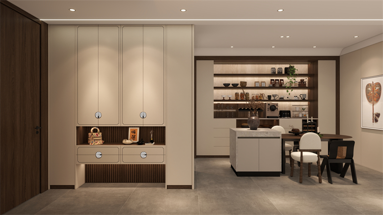 玄關,作為家的第一道風景,在方寸間盡顯山水意趣與禪意。拉手與門型的設計靈感源自禪意中式美學中的海棠花與水墨畫,仿佛一幅微縮的山水畫卷,盡顯文人意趣。綺羅布紋飾面質(zhì)感細膩,在光影的流轉中透露出織物的溫潤與雅致。展示格中,一器一物皆成景致。一入門,便能感受到“小隱于市”的寧靜與淡泊。