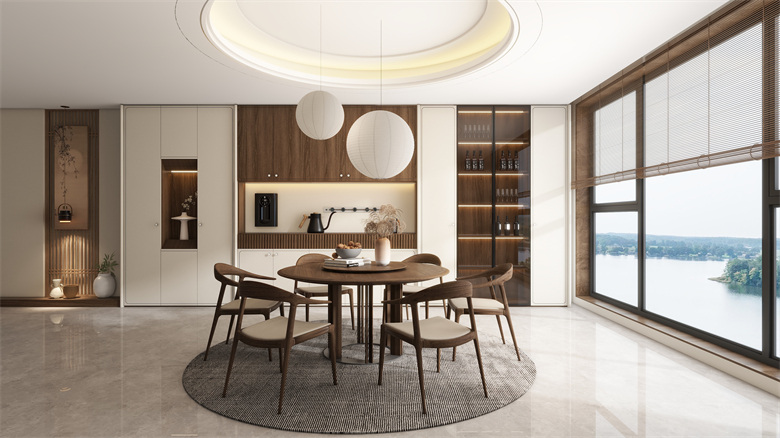 餐廳區(qū)域?qū)⒐艠沩嵨杜c精妙結構融入室內(nèi)。疊級設計營造視覺漸進,內(nèi)斂卻不失格調(diào);格柵抽屜設計精妙,以高定工藝打造含蓄的中式美感。圓形吊燈與天花板環(huán)形燈帶相呼應,柔和的燈光照亮整個用餐區(qū)。細膩木紋裝飾與現(xiàn)代簡潔的線條相融合,展現(xiàn)了禪意新中式的精致與內(nèi)斂,在簡與繁、虛與實之間,構筑出一個既能滿足現(xiàn)代生活需求,又能安放文人雅趣的餐飲空間。
