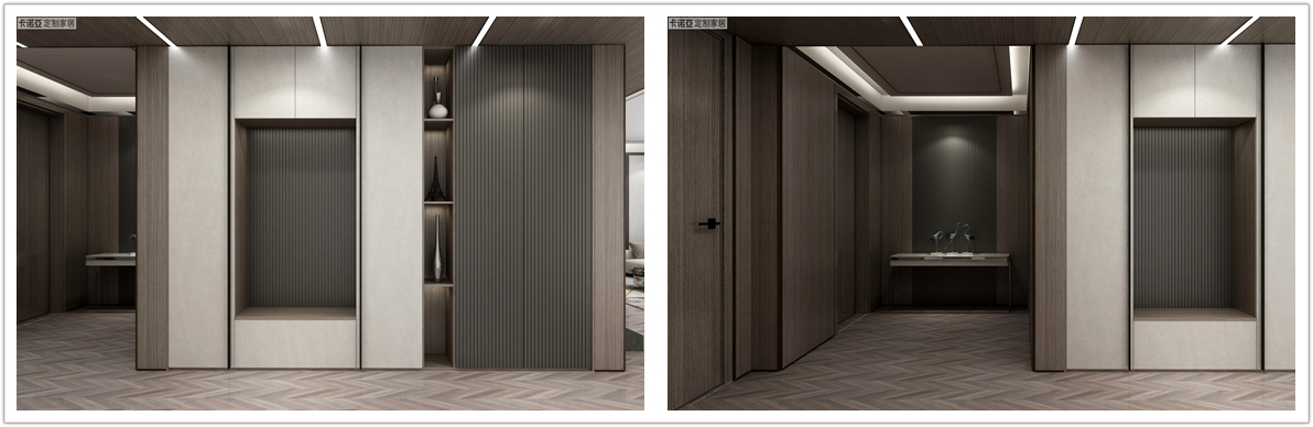 流金溢彩系列,整體設(shè)計(jì)不繁瑣,不重色彩的濃烈而重線條的表達(dá),以局部的細(xì)節(jié)彰顯空間獨(dú)特的韻味和文化厚度,形成傳統(tǒng)與現(xiàn)代元素和諧共生的新中式空間。流金溢彩系列點(diǎn)睛之筆在于門板、護(hù)墻板、抽面采用內(nèi)嵌式回紋型金屬條,一改門板平面單一的刻板印象,滿滿的輕奢高級感撲面而來。