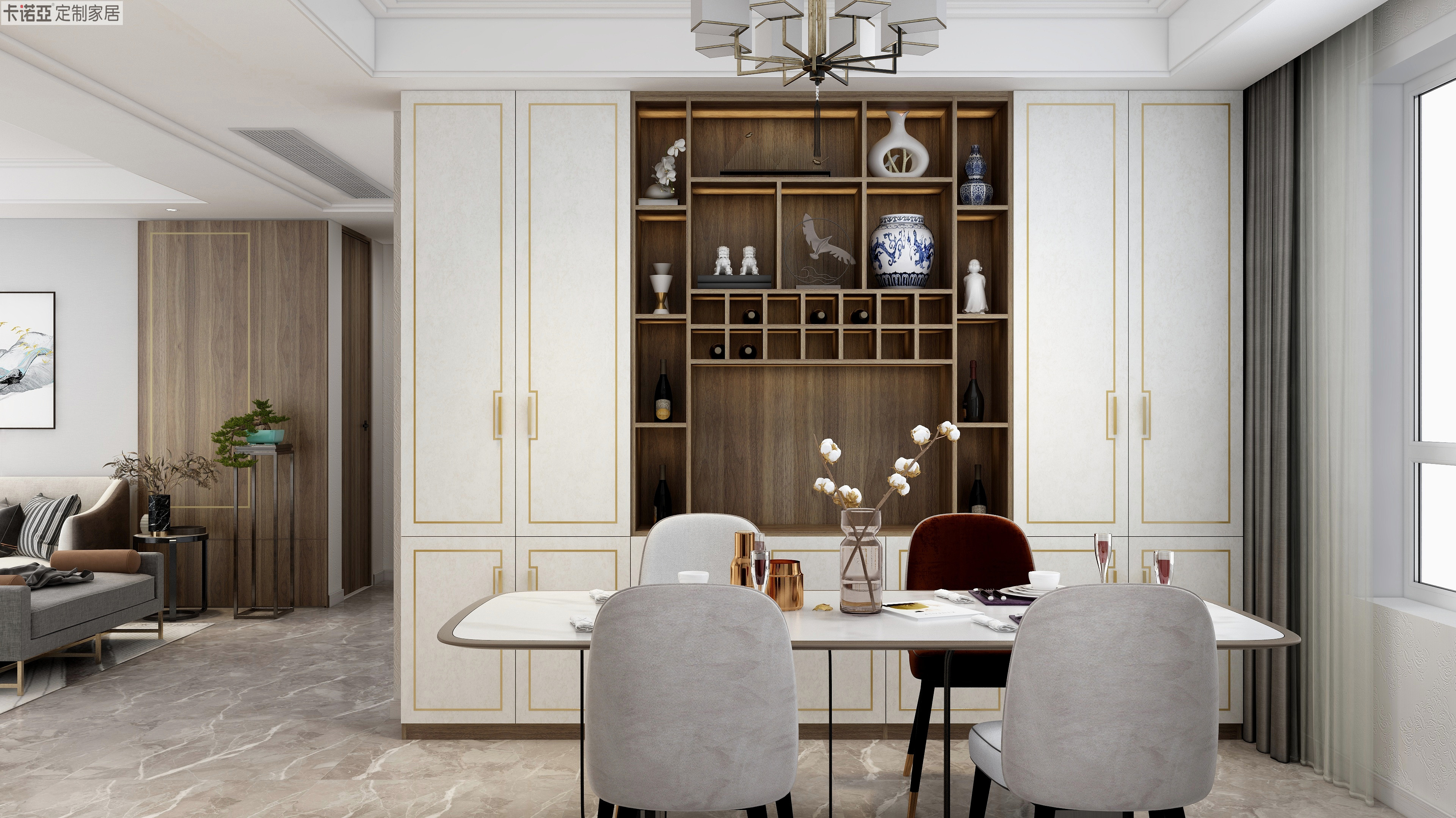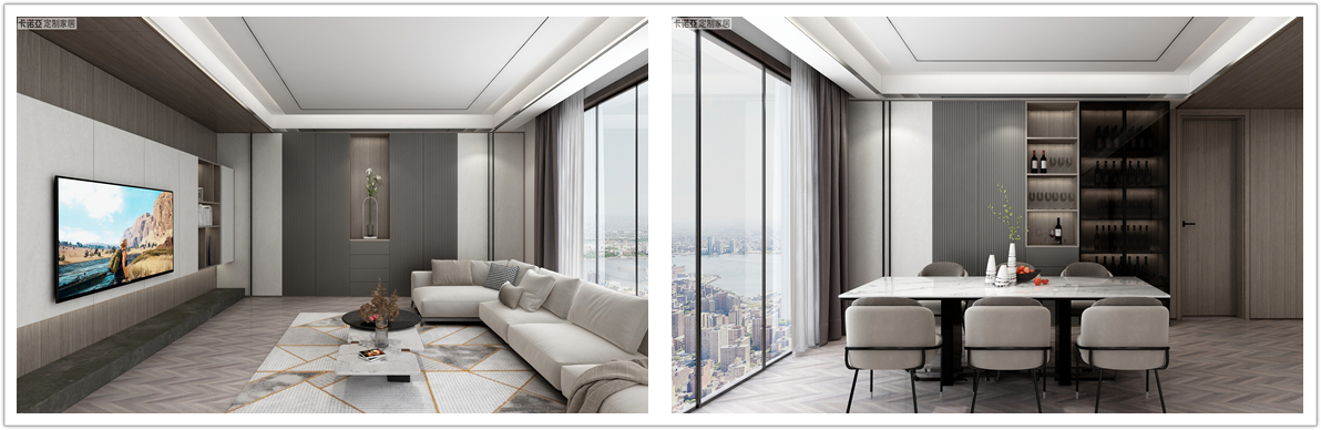 卡諾亞“銀絲木”大面積運(yùn)用,“慕尼黑”格柵門板作為點(diǎn)綴,搭配米色的沙發(fā)和白色大理石餐桌,整個(gè)空間硬朗有張力,凸顯現(xiàn)代都市生活注重快節(jié)奏與簡潔實(shí)用。