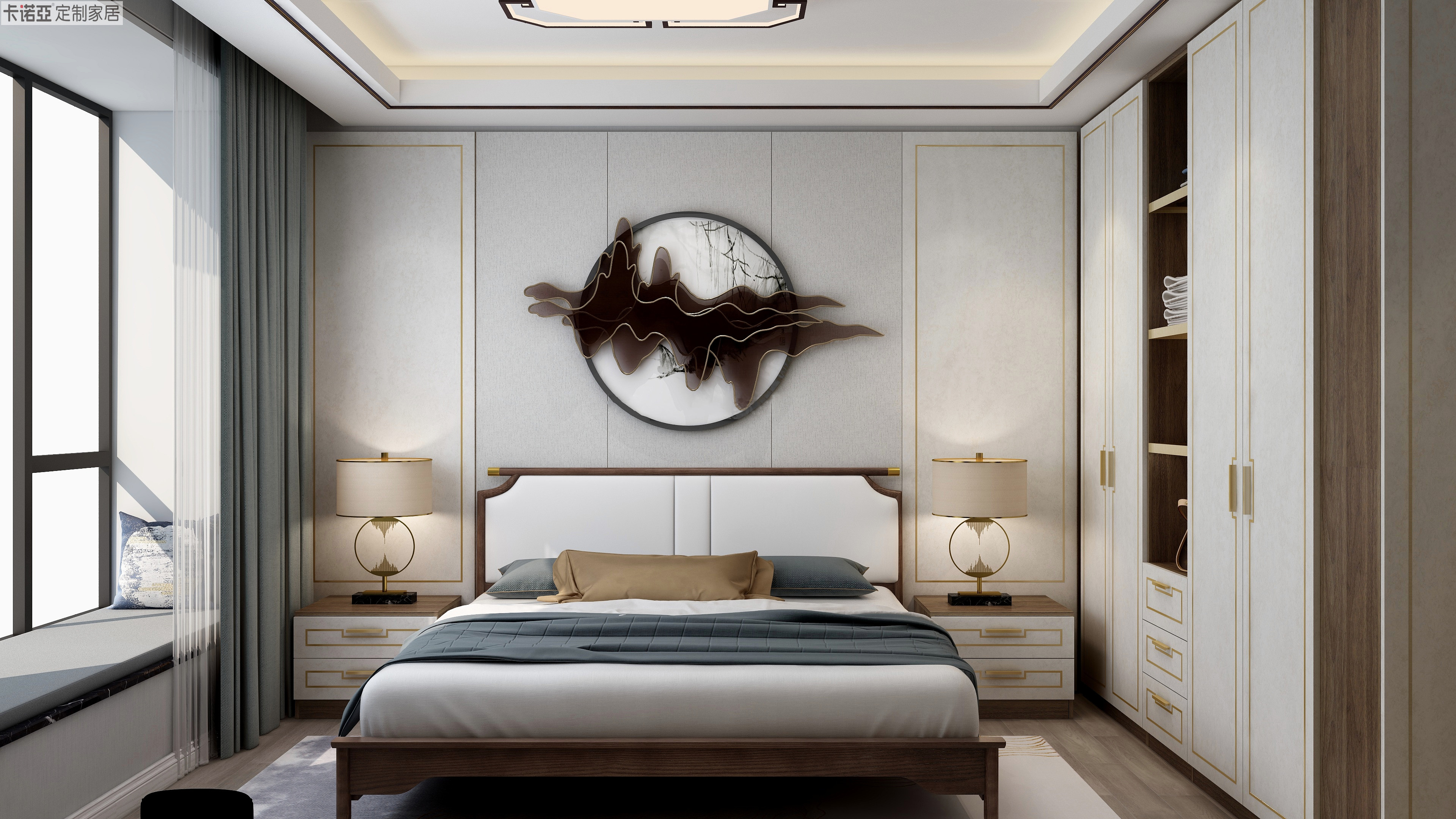 米色成為空間的主色調(diào),輔以木紋材質(zhì),自然而舒適,營造良好的睡眠環(huán)境?;丶y型金屬條及黃銅色拉手點(diǎn)綴空間,盡顯新中式風(fēng)格的輕奢觀感。