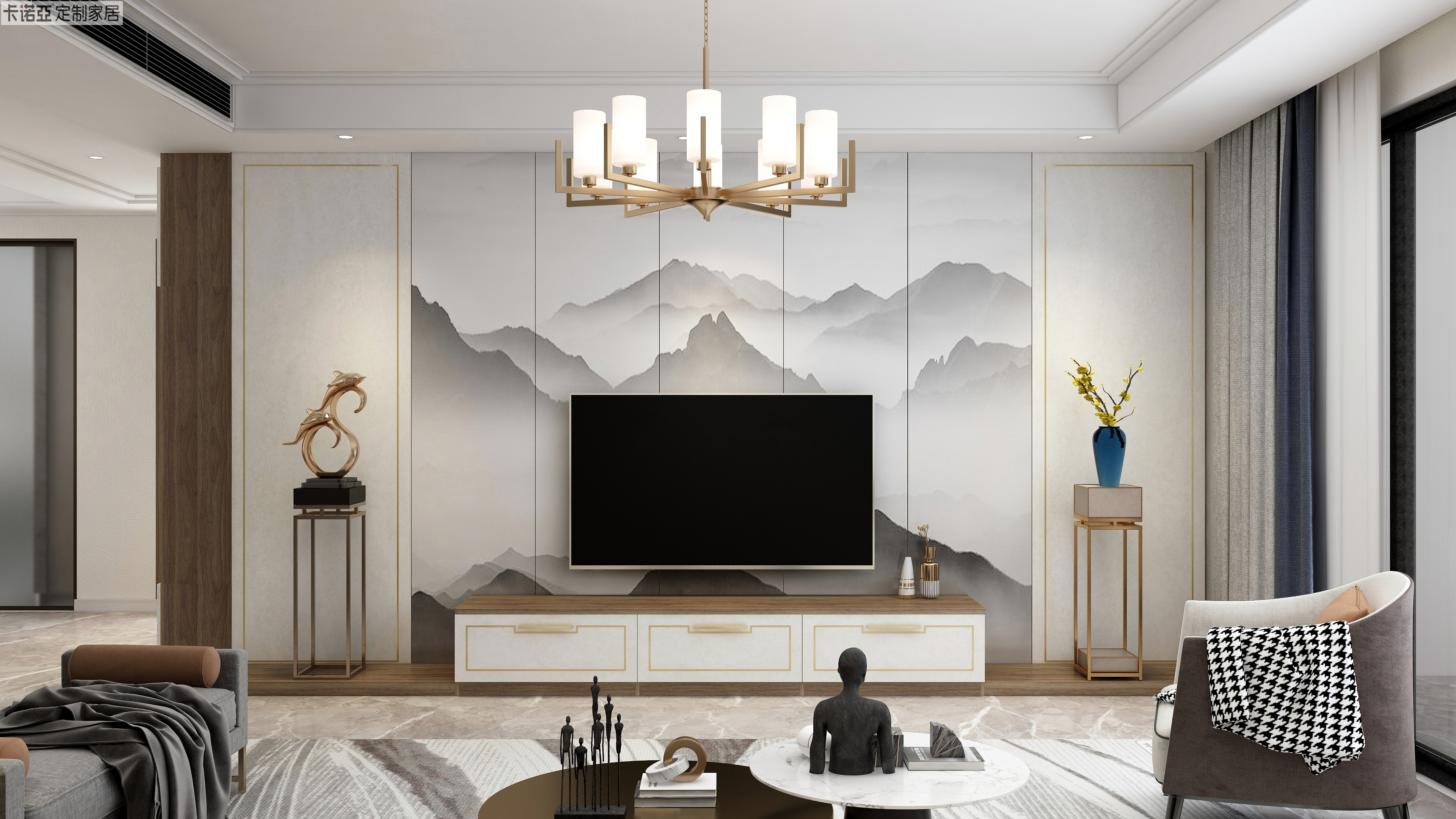 3D中式山水畫作為電視背景墻,讓人耳目一新。搭配側(cè)邊對稱的護(hù)墻板,采用回紋型金屬條的金邊勾勒,于無聲處驚鴻一瞥,營造意境悠遠(yuǎn)的東方禪意空間。