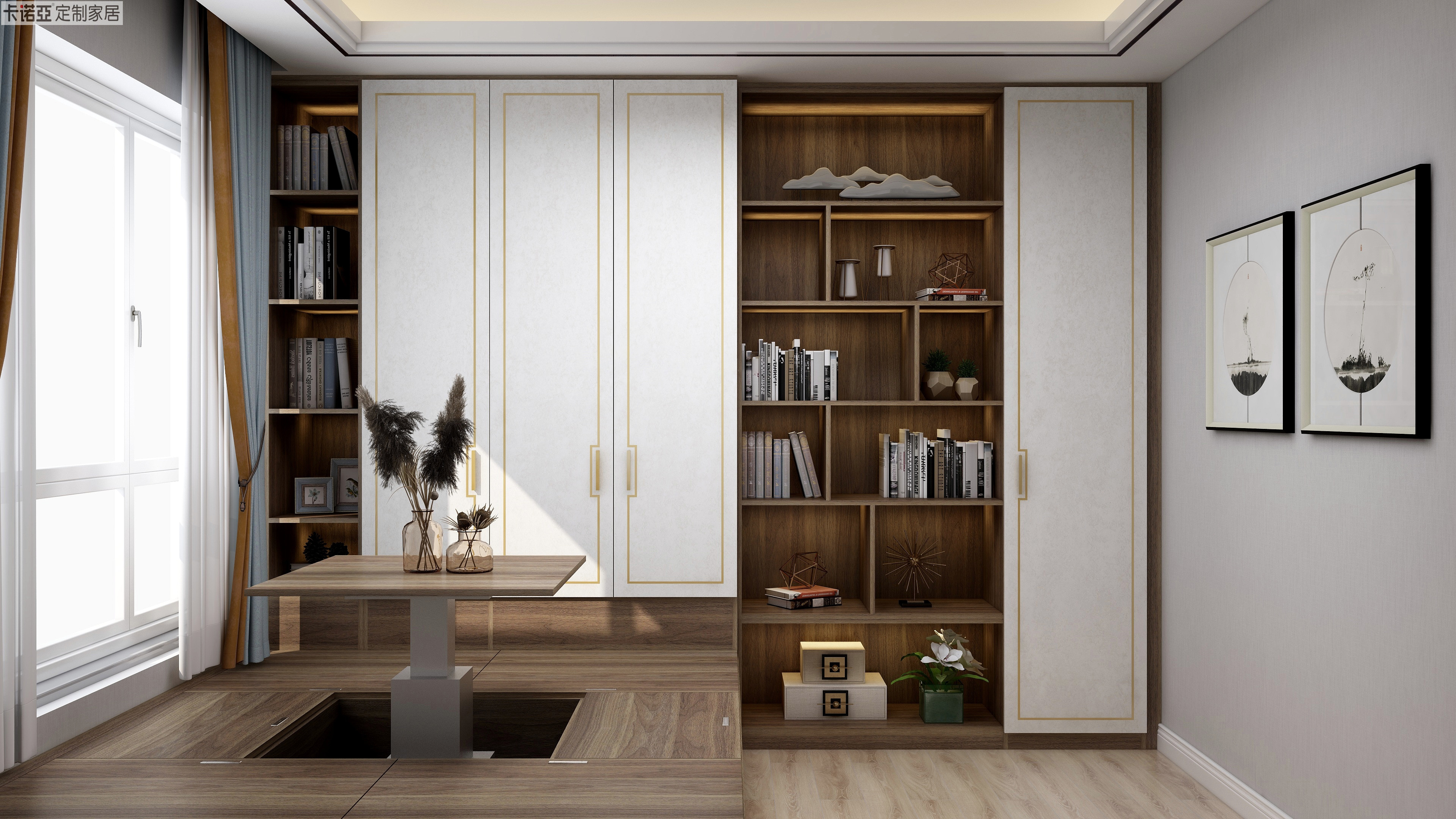 榻榻米是多功能房的不二之選,采用卡諾亞“御品木”的榻榻米,彰顯東方式書房的戀木情結(jié)。與榻榻米連為一體的書柜,柜門采用淺色花紋,表面同樣嵌入回紋型金屬條,加上金屬拉手的點(diǎn)睛,讓中式書房寧靜致遠(yuǎn)中綻放優(yōu)雅之美。