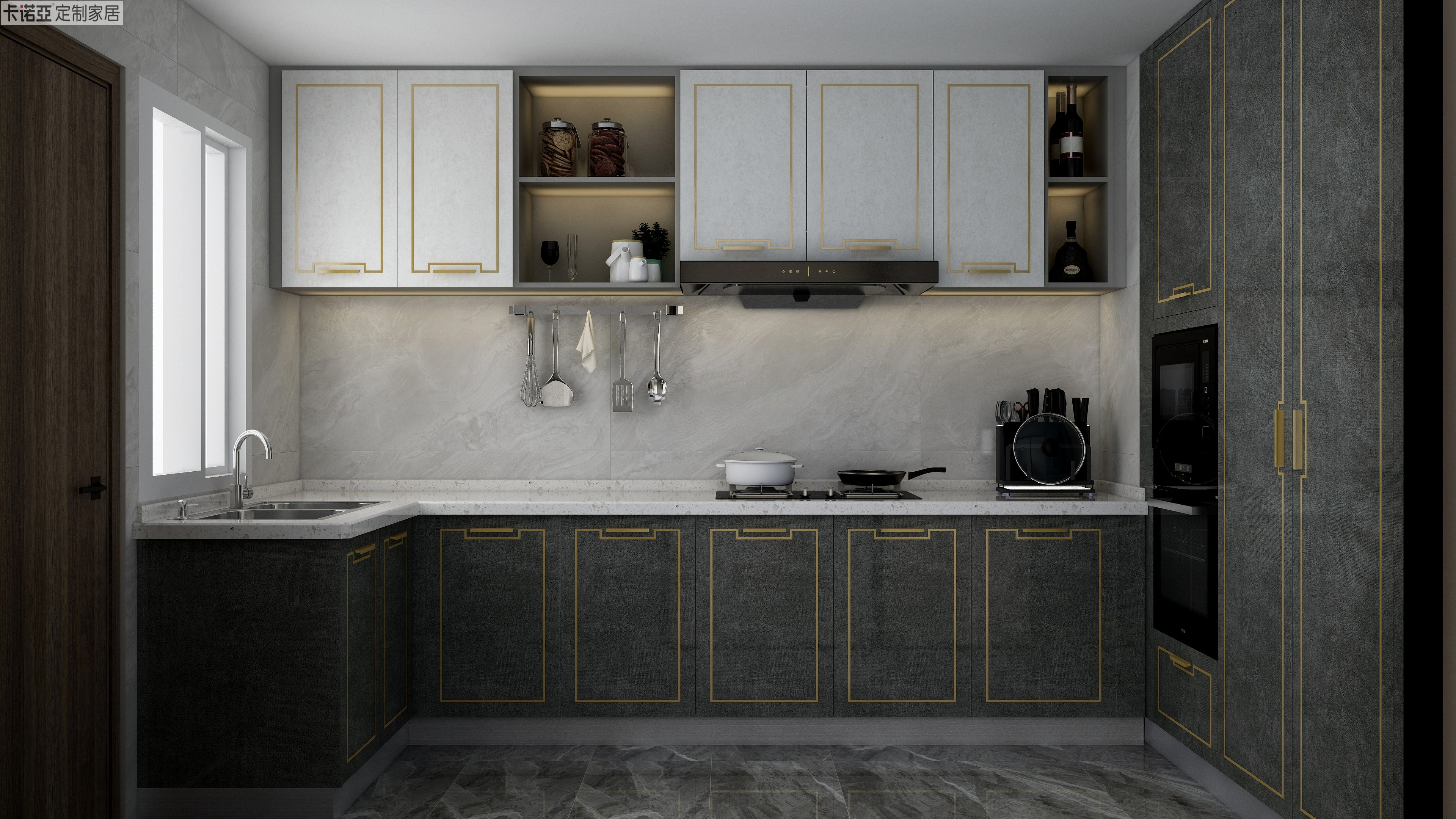 君子遠(yuǎn)庖廚,當(dāng)代君子則樂于下廚。吊柜地柜一明一暗的撞色設(shè)計(jì),讓廚房多了一份視覺層次之美,表面同樣嵌入回紋型金屬條,高端廚房呼之欲出,在這樣的唯美空間一展廚藝,何樂而不為?