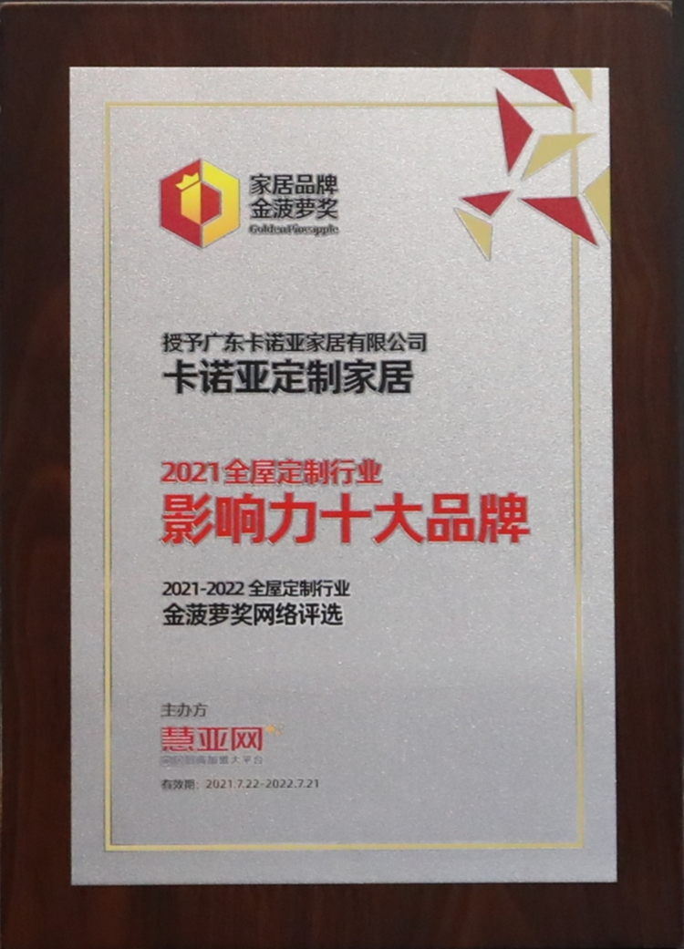 2021年7月22日,中國建博會×慧亞網(wǎng)聯(lián)合主辦的第六屆中國大定制家居營銷發(fā)展論壇暨中國家居品牌金菠蘿獎頒獎盛典,在廣州舉行。歷經(jīng)半年來自經(jīng)銷商與用戶網(wǎng)絡(luò)票選結(jié)果的公布,卡諾亞定制家居憑借強大的品牌影響力、優(yōu)質(zhì)的產(chǎn)品與星級的服務(wù),最終脫穎而出,榮膺“2021全屋定制行業(yè)影響力十大品牌”美譽。