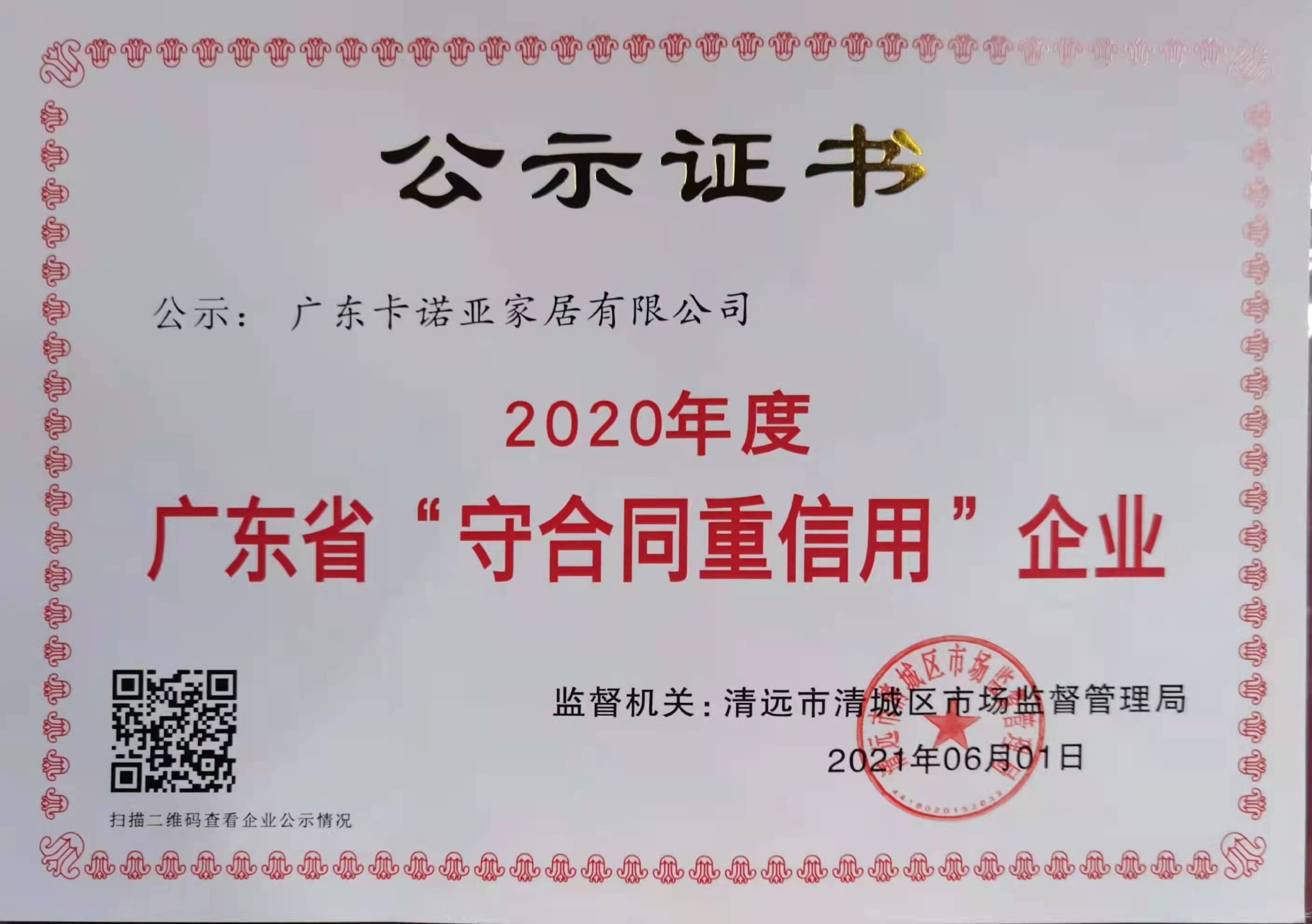 近日,廣東省清遠(yuǎn)市清城區(qū)市場監(jiān)督管理局對廣東省守合同重信用企業(yè)進(jìn)行公示,卡諾亞專注定制家居20年,一直以來憑借企業(yè)自身完善的合同管理機制及良好的合同履約狀況等企業(yè)誠信信用體系,連續(xù)兩年榮獲廣東省“守合同重信用”企業(yè)稱號,這是對卡諾亞誠信守約的經(jīng)營管理、優(yōu)良的信用文化建設(shè)與良好的客戶口碑的肯定。